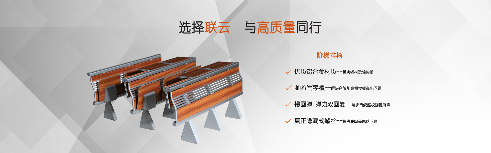佛山聯(lián)云是廣東一家專業(yè)生產(chǎn)禮堂椅、階梯排椅、課桌椅、等候椅的廠家。產(chǎn)品符合人體工學(xué)原理的坐墊、靠背、扶手,環(huán)保優(yōu)質(zhì)的表面織物和舒適柔軟的填充物質(zhì),日臻純青的制作工藝,兼顧唯美造型與多樣化實(shí)用功能,聯(lián)云對(duì)每一個(gè)細(xì)節(jié)都努力用心,只為給你創(chuàng)造超越身心的完美體驗(yàn)。